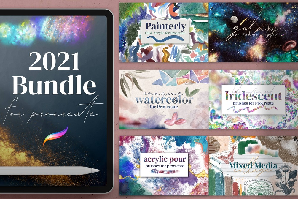 This bundle includes 6 brush sets which were released in 2021 - Painterly, Galaxy, Amazing Watercolor, Iridescent & Holographic, Acrylic Pour and Mixed Media Collage. Please note: the 2020 Bundle & The 2021 Bundle do not include any of the same brush sets.