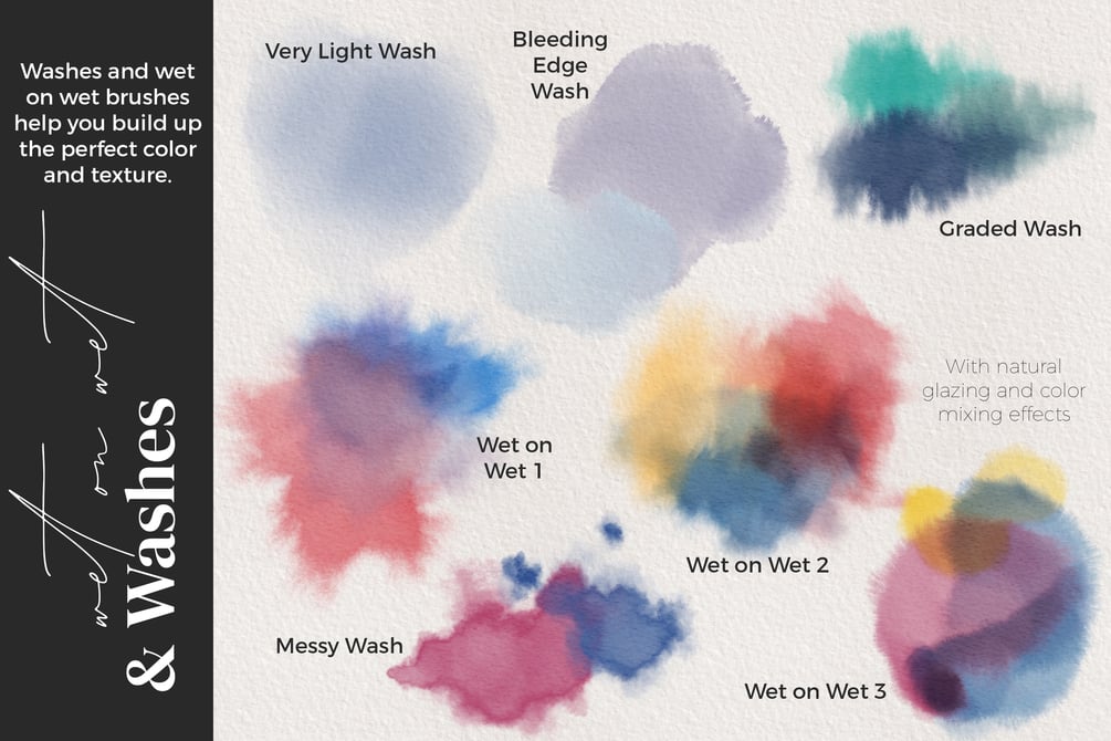 - 12 Dynamic watercolor texture brushes, with an extra Dual Color version for each. Use these to make unique backgrounds, add texture to shapes, or cover large areas.