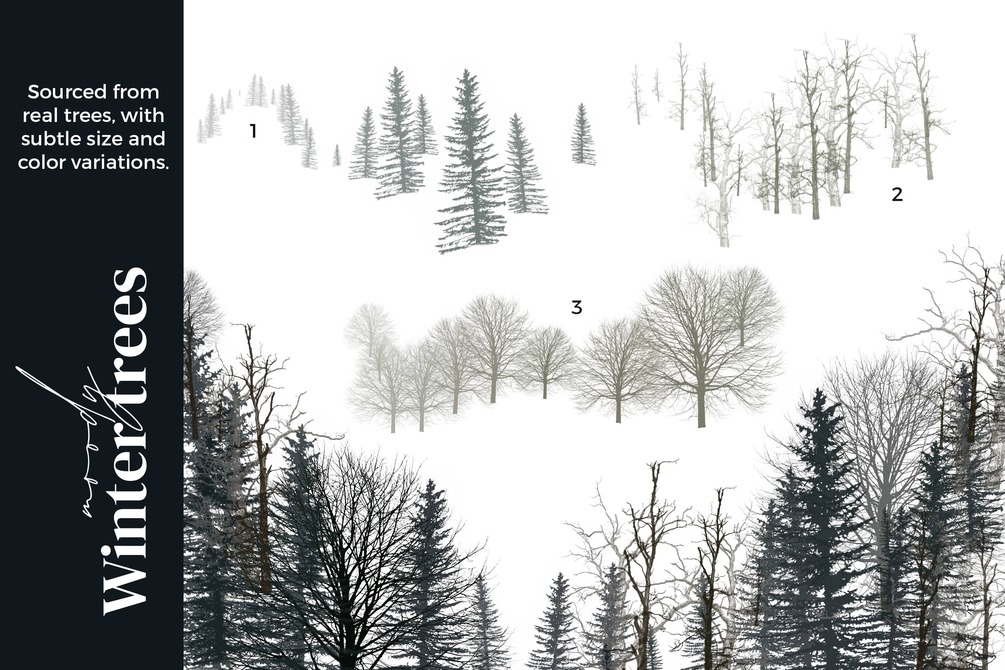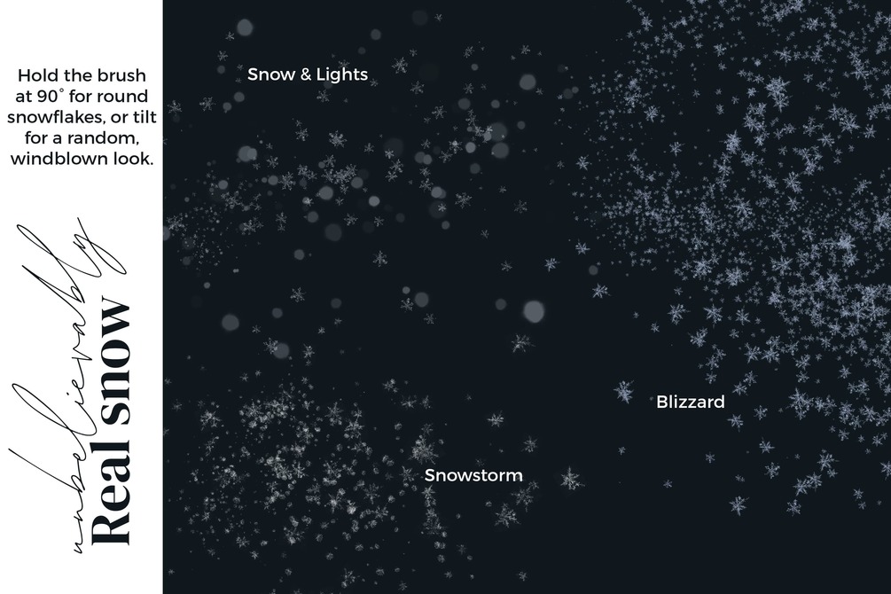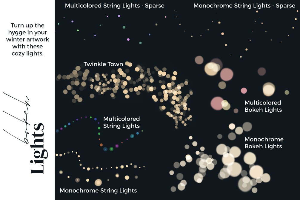 This Christmas, turn down the stress and turn up the "hygge" with this endlessly fun new brush set. From impossibly real snowflakes and magical ice crystals, to cozy twinkle lights and barren trees, these brushes will help you create gorgeous winter scenes with infinite possibilities. Each brush is sourced from real, raw images from nature to bring your artwork to another level of quality and detail.