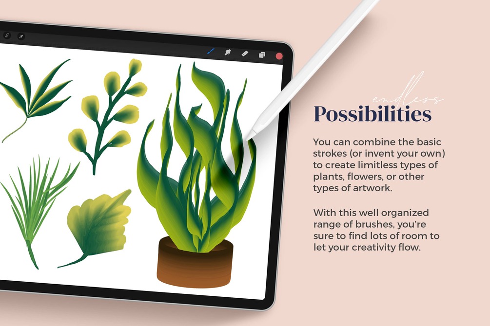 You can combine the basic strokes (or invent your own) to create limitless types of plants, flowers, or other types of artwork. With this well organized range of brushes, you’re sure to find lots of room to let your creativity flow.
