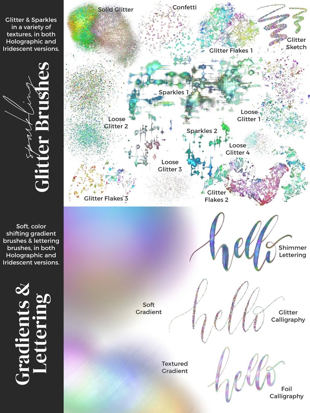 This brush set contains two versions (Holographic and Iridescent) of the same 40 brushes. Both versions have color changing properties but they differ in the range of color change.