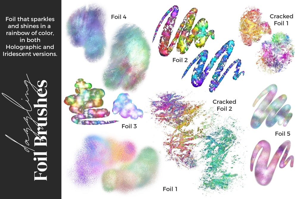 - Two sets of 40 dynamic and pressure sensitive brushes for Procreate - Holographic and Iridescent.