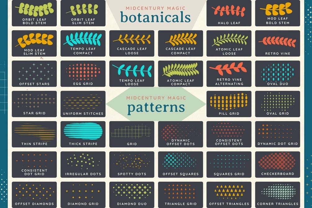 Midcentury Magic captures the spirit of mid-century design without limiting you to one specific style. Work in abstract compositions, layer patterns over typography, build textured backgrounds, or create something completely unexpected. The collection gives you room to explore.