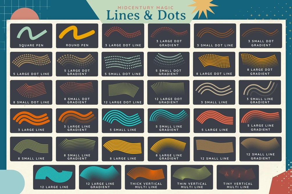 After more than a year of development, Midcentury Magic has evolved into a comprehensive collection of 120 brushes for anyone who loves the playful energy of midcentury modern design. This isn't your typical illustration focused brush pack: these brushes are built for experimenting with color, pattern, and texture in ways that feel fresh and spontaneous.