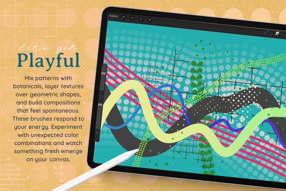 Every pattern brush responds to Apple Pencil pressure, so lines get thicker as you press harder. The halftones have even more range, transitioning from barely there to fully opaque. Textures are semi-transparent and layer beautifully in any color. Botanical brushes capture that atomic age aesthetic. The lines and dots brushes create those flowing, rhythmic motifs that define so much midcentury work.